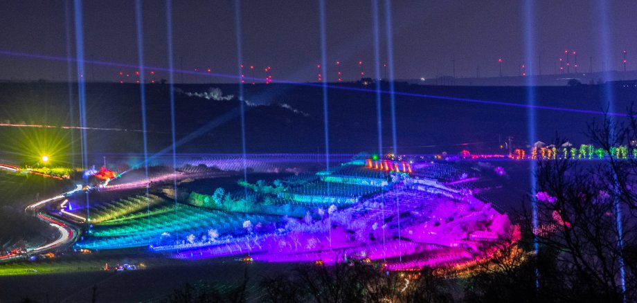 Die Weinbergnacht 2026 führt in den Abendstunden (17:00 bis 23:00 Uhr) des Frühjahres durch die Weinberge der Kurstadt. Eine einmalige Aussicht auf die Stadtsilhouette, den verträumten Ortsteil und Weinort Ungstein sowie etliche Sehenswürdigkeiten wie den Gradierbau, das Dürkheimer Riesenfass, die Michaeliskapelle – der Geburtsort des Dürkheimer Wurstmarkts, dem größten Weinfest der Welt – und das Römische Weingut „Weilberg“ machen diese zwei Nächte zu einem ganz besonderen Erlebnis. Nicht zu vergessen: Mit Skybeamern, LED-Bars, Leuchtwürfeln und Lasertechnik werden die Bad Dürkheimer Weinlagen gekonnt in Szene gesetzt. „Zur Weinbergnacht treffen also Top-Reiseziele auf besten Dürkheimer Wein inmitten faszinierend illuminierter Pfälzer Weinberge“, freut sich der zuständige Erste Beigeordnete Claudius Güther.